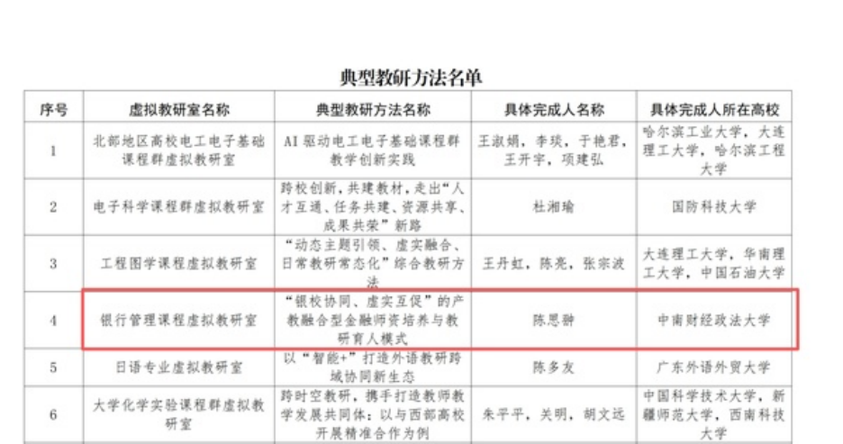 2025年12月10日,虚拟教研室项目秘书处和全国高等学校教学研究中心公布了《2025年度虚拟教研室试点建设典型名单》。我校金融学院牵头的教育部首批虚拟教研室建设试点的银行管理课程虚拟教研室申报的《“银校协同、虚实互促”的产教融合型金融师资培养与教研育人模式》成功入选典型教研方法。这是我校虚拟教研室建设首次获得教育部委托的国家级典型认定,标志着我校在金融学科数字化智能化教研改革领域迈入全国前列。