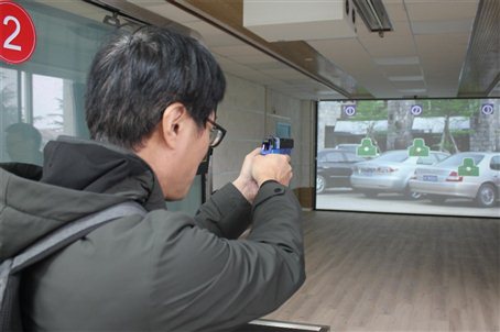 有多位老师在射击及战术实验室体验解救人质的现场实景以及电子模拟射击训练。实验设备能够智能判断出最佳射击时机,在寓教于乐的同时提升学生的实操技能。