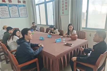 4月18日上午,调研组一行前往谷城县五山村、石花村、殷畈村等地开展实地调研,深入乡镇考察公共法律服务站的建设运行情况,与全国模范人民调解员易守银交流调解基层矛盾纠纷的经验。调研组还发放了《谷城县公共法律服务满意度调查表》,后期将在收集到的问卷数据基础上对谷城“县、乡、村三级联动的人民调解网络”进行总结优化。