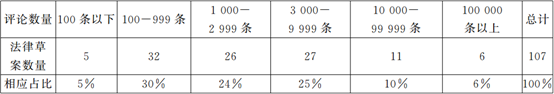 在衡量公众参与有效性的指标中,参与人数反映了公众参与的广泛程度,与立法民主化程度密切相连。评论意见条数则在一定程度上体现了参与的深度和系统程度,意味着公众参与为立法决策者可能提供的信息规模,与立法科学化的目标直接相关。2005-2016年,通过征求意见系统共收集到的评论意见是2428256条,参与者平均每人仅提出4.38条意见。对评论意见数量进一步分类统计后发现,在107次征求意见过程中,有30%的草案收到不足1000条意见,有5%的草案只收到不足100条意见。两者加总约有35%的草案稿收到的评论意见不足千条。(参见表3)