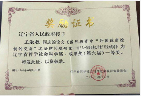 王淑敏教授的论文《国际投资中“外国政府控制的交易”之法律问题研究——由“三一集团诉奥巴马案”引发的思考》(原载《法商研究》2013年第5期,责编:何艳)荣获“辽宁省哲学社会科学奖.成果奖”一等奖。