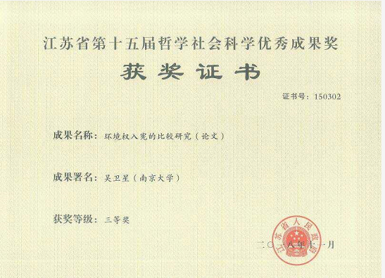 吴卫星副教授的论文《环境权入宪的比较研究》(原载《法商研究》2017年第4期,责编:余耀军)荣获“江苏省哲学社会科学优秀成果奖”三等奖和“中国法学家论坛征文奖”二等奖。