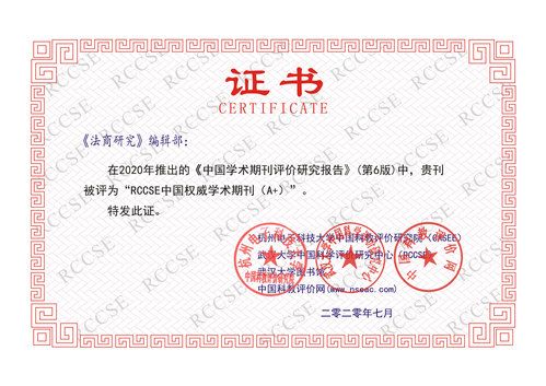 《中国学术期刊评价研究报告》于2009年3月正式推出第1版,于2011年、2013年、2015年、2017年、2020年分别推出第2版、第3版、第4版、第5版和第6版。现已有2000多家出版机构和800多个科研管理部门将该报告的评价结果作为办刊质量评估和科研成果统计的重要参考工具。自RCCSE创立以来,《法商研究》多年位列其权威期刊。