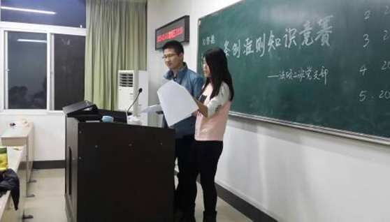 本次学习活动采用分组知识竞赛的方式进行,主要分为三个环节,第一个环节是必答题环节,第二个环节为抢答题环节,为了活跃气氛,第三个环节为听红歌猜歌名的环节。本次班会由副班长孔丹丹和组织委员冯荣琨担任主持,万丹丹同学负责分数记录和拍照。