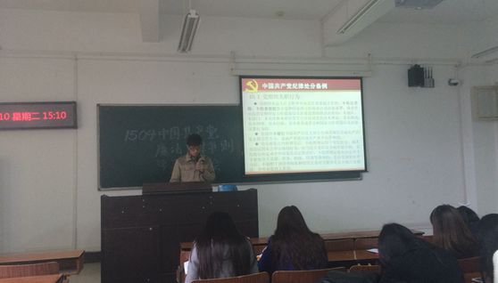 第二部分是由党支部副书记骆祥主持讲解视频的学习环节,视频内容讲解“全面二孩”等八大新热词,充实而丰富的内容吸引了同学们的兴趣。第三部分是讨论发言学习环节,同学们在热烈的讨论之后,纷纷上台发表学习心得。党员代表王聪谈了对全面二孩放开的见解,群众代表王红进对“2020年贫困县全部摘帽”表达了殷切期盼,赵春晖谈论了对《五中全会公报》中关于划转部分国有资本充实社保基金的认识。大家畅所欲言,不管是赞扬的慷慨之词还是批评的建议之策,都表现了一颗颗充满正能量的爱党爱国之心。