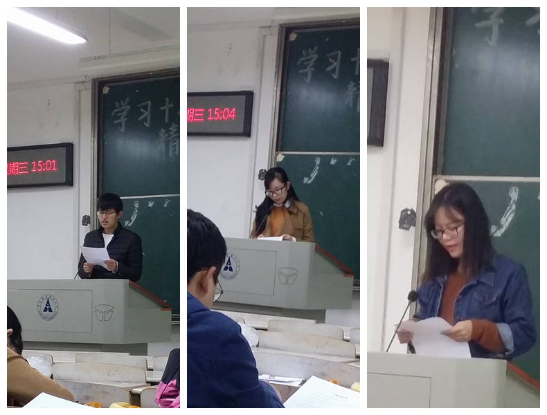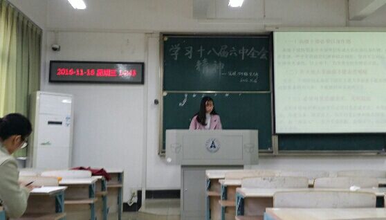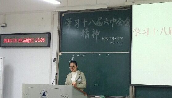 (通讯员 吴周求 摄影 吴周求)为了号召党员积极学习十八届六中全会精神,法硕中心1503班党支部于2016年11月16日下午2点在文添楼305教室开展以“学习全会精神,提高党员修养”为主题的学习活动。全体党员和入党积极分子参加了本次活动,活动由党支书卢彩香主持。