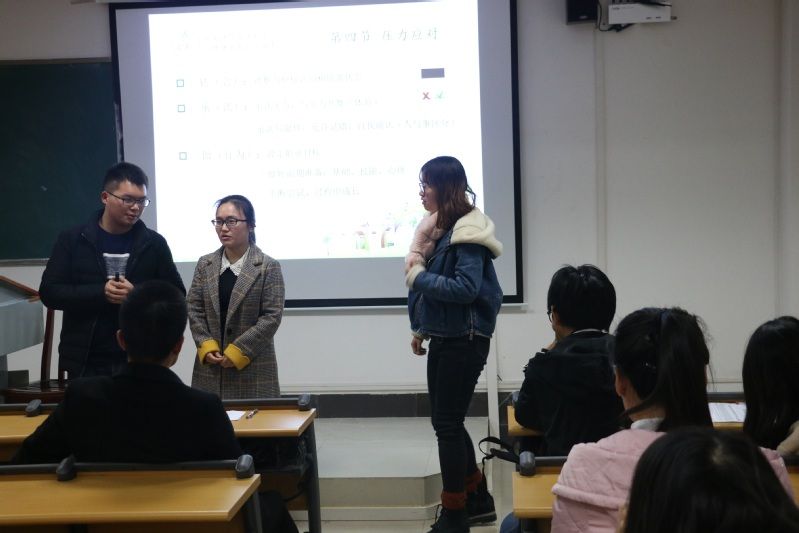 第二场讲座于2018年11月22日晚7点在文添楼501教室举行。讲座伊始,余金聪老师以一个“摸鼻子摸耳朵”小游戏引入主题,向在坐同学发问“我们面对的压力有哪些”。同学们表示,在校的压力主要来自于求职、学业、情感等方面。对此,余老师分别从压力的概念、压力产生的原因、压力的影响、压力的应对四个方面予以解读。余金聪老师的讲课非常生动,语言幽默风趣,穿插在讲座过程中的小测试、小短剧、提问等互动使整场讲座的气氛变得很热烈,现场的同学们反馈积极。最后,余金聪老师特别提醒大家注意:一定要不断尝试,不设限,不比较,不放弃,希望永远都在!