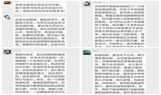 第三个部分是学习《习近平:在纪念五四运动100周年大会上的讲话》、《人民日报社论:让五四精神在新时代放射新的光芒》等文件内容。参加线上党日活动的党员事先进行了有关文件内容的学习,大家纷纷发表了自己关于新时代青年如何弘扬五四精神的看法。讨论学习过程中,徐梦舸同志说到:“弘扬五四精神,要刻苦学习,掌握真才实学,同时也要勇于实践,提高能力素质。青年一代要珍惜时光,掌握事业社会发展需要的技能和本领,在实践中成长成才。”艾秋禾同志发言说到:“爱国和进步,是五四精神的基础,每一名青年都应该终身追求爱国和进步。此外,民主和科学,是五四运动的核心与动力,作为青年一代的学生,一定要踏实学习专业知识,打好基础,成为新时代的技术能手。”赵昆同志补充说到:“五四精神也要求我们积极创新,要敢为天下之先,要朝气蓬勃善创新,以创新奋进来面对新时代。具体而言,就是要求青年们要朝气蓬勃的投入到自己的学习、生活和工作中,用青春和智慧创造属于青年的独特荣光。”