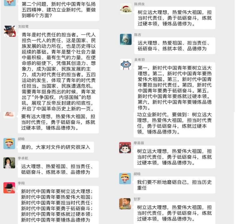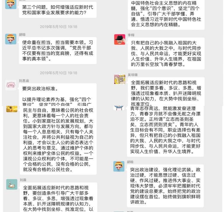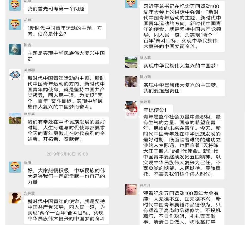 接着大家围绕着“新时代中国青年运动的主题、方向、使命是什么”;“新时代中国青年弘扬五四精神、建功立业新时代,要做到哪6个方面?”;“如何增强适应新时代党和国家事业发展要求的能力?”展开了讨论。大家各抒己见。