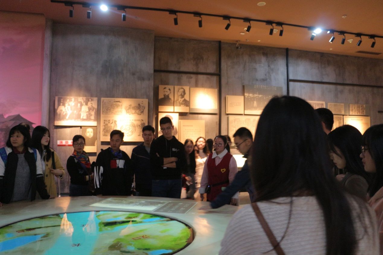 在讲解员的带领下,同学们依次参观了“晚清中国”、“革命原起”、“武昌首义”、“创建共和”、“辛亥百年”五大展区,这五大展区将辛亥革命的历史与现实淋漓尽致的展现了出来,所有人的内心都是震撼而沉重的,仿佛穿越了百年时空,回到了一百多年前的起义场面,耳边回响着革命先烈们的呼号与呐喊。第一展厅“晚晴中国”,此时的中国被列强分割得支离破碎已经摇摇欲坠,签订了《南京条约》、《北京条约》等12个不平等条约,我们要记住历史的屈辱,牢记落后就要挨打;第二展厅“革命原起”,伟大的民主革命先行者孙中山,受西方民主革命思想的影响,走上了革命的道路;第三展厅“武昌首义”,也是馆内最核心的一个展厅,青石板、老屋、古树、小巷茶馆、德和酒庄、街上奋勇当先的革命党人,一切都真实还原了当时首义的场景,紧张的氛围深深地感染了认真参观的同学们;第四展厅“创建共和”,1912年1月1日,孙中山在南京宣誓就任中华民国临时大总统,中华民国南京临时政府宣告成立;第五展厅“辛亥百年”,百年辛亥,风云激荡,辛亥革命推翻帝制、建立共和的伟业,彪炳千秋,值得所有同学们铭记心中,时刻缅怀。