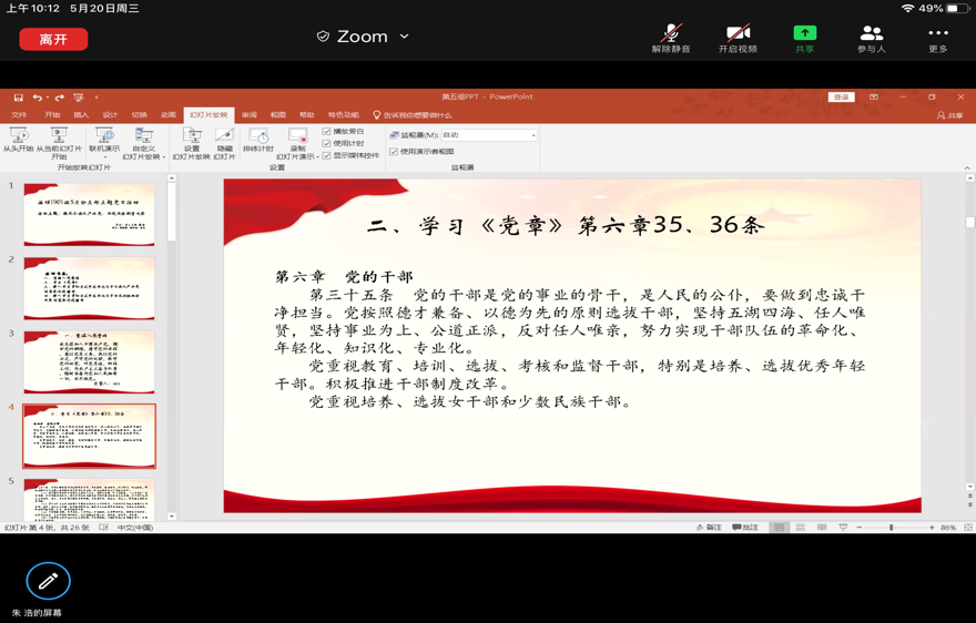 第二项:学习党章第六章——党的干部第35、36条规定内容。朱浩同志带领大家对党的干部这一章进行了学习。本章主要内容包括介绍党的干部的角色定位——是党的事业的骨干,是人民的公仆;介绍了当选拔干部的一系列标准;第36条阐述了党的干部必须具备的六项基本条件。通过对本章的学习,我们对党的干部的形象有了初步的了解,清楚了党的干部所必备之要件,亦体会到党的基本宗旨亦贯穿在党开展工作的方方面面。