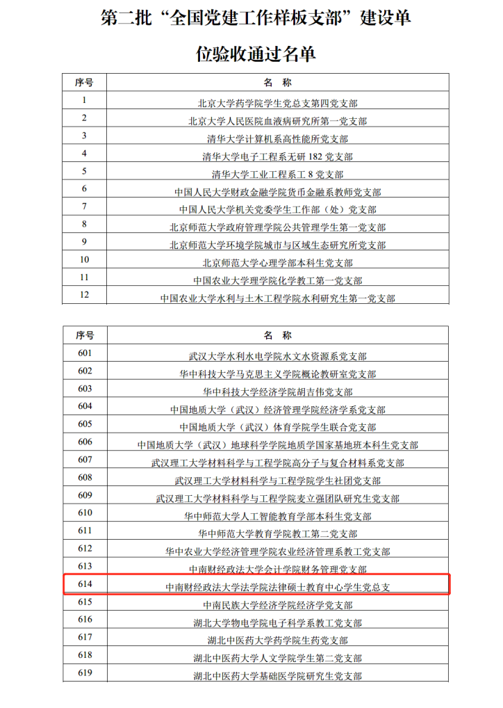 (通讯员 马晨娇)日前,教育部办公厅公布第二批新时代高校党建示范创建和质量创优工作和首批高校“双带头人”教师党支部书记工作室建设单位验收通过名单。经建设单位对标自查总结、省级党委教育工作部门把关审核、教育部思想政治工作司审查,法律硕士教育中心学生党总支顺利通过第二批“全国党建工作样板支部”验收。