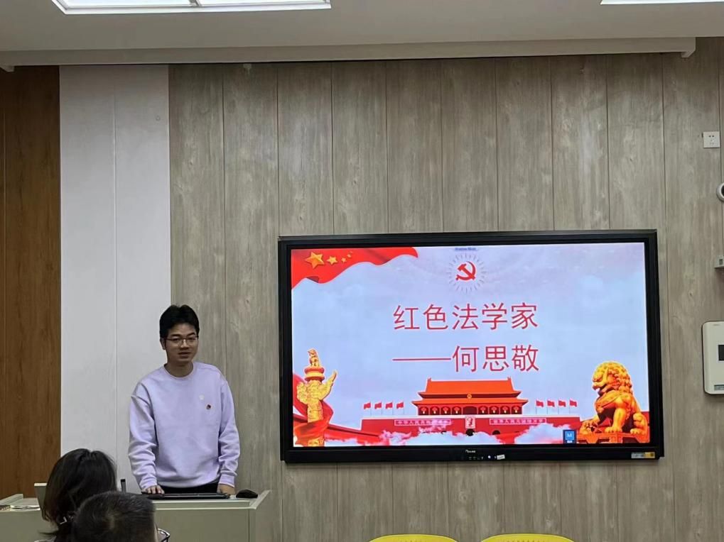 为进一步推进党史学习教育,两支部充分发挥支部成员法学学科背景,共同学习了红色法学家何思敬的故事。徐振斌同志分别从人物简历、人物经历、人物评价三个方面展开了对何思敬的介绍。通过对何思敬同志生平故事的进行学习,2204班汪星宇同志表示作为法学生要学习何思敬以天下为公的崇高情怀和担当正义、求真务实的伟大精神,更加坚定了为中国特色社会主义法律事业奋斗的决心。