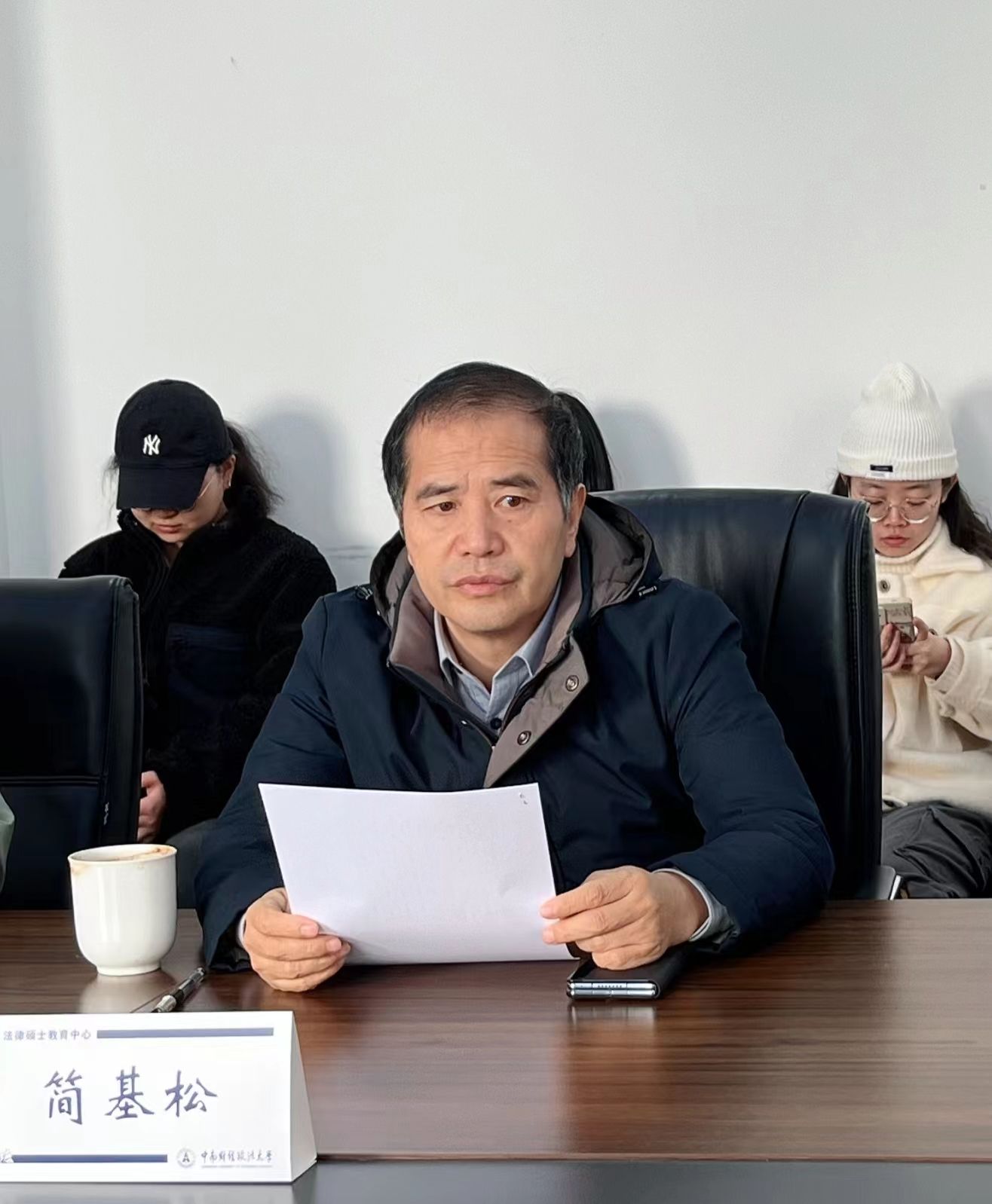 新闻网讯(通讯员 杨捷 陈璇 学生通讯员 商成)为深入贯彻落实习近平总书记关于研究生教育工作的重要指示和教育部《关于深入推进学术学位与专业学位研究生教育分类发展的意见》文件精神,落实“双导师制”,全面提升法律硕士拔尖创新人才自主培养质量,法律硕士教育中心于12月28日下午在文治楼515会议室采用线上线下相结合的方式召开“合作导师回校领航计划”第四场合作导师与研究生见面会。法律硕士教育中心主任简基松,副主任王广波,教学秘书杨捷,湖北今天律师事务所管理合伙人、执行主任李家军,合伙人陈凌、胡杰、刘飞志,律师王欣子、鄂燕菲等参加本次见面会。会议由王广波主持。
