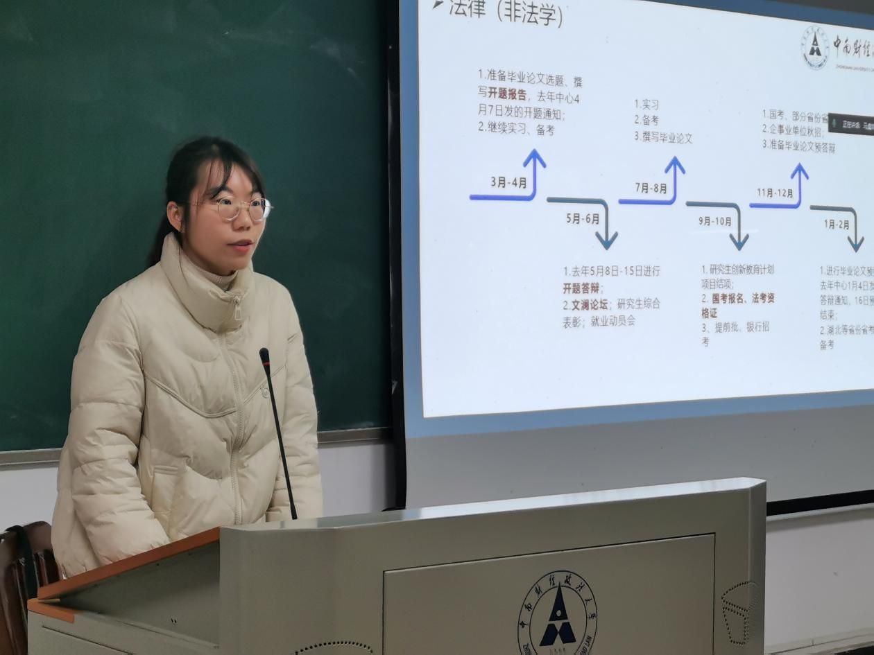 为进一步增强学生的时间利用意识和职业规划能力,马晨娇结合目前法律(法学)和法律(非法学)专业的实际情况,为同学们制作了清晰的时间规划轴,提醒同学们注意答辩、国考、省考等重要的时间点,根据个人实际情况提前做好安排,兼顾好论文和实习就业等各项事务。同时,她指出,就业离不开自身过硬的法律基本功,鼓励同学们积极写作,把握投稿机会,不断提升自身学术素养。