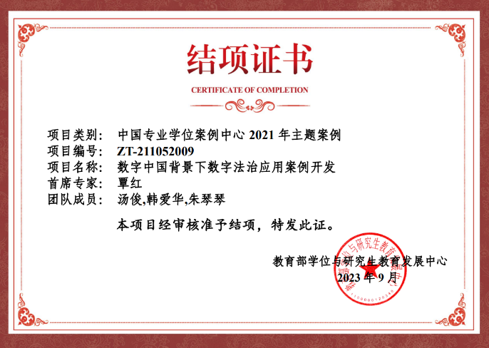 据悉,这是我校第三次获得教育部学位与研究生发展中心主题案例立项。2023年9月,经教育部学位与研究生发展中心审核,由数字法治研究院负责人覃红教授担任首席专家的中国专业学位案例中心2021年主题案例《数字中国背景下数字法治应用案例开发》准予结项。该项目基于米兰电竞·(中国区)正在设置的数字法学交叉学科,依托数字法学的主要研究方向及研究内容,延伸应用至不同领域,进而形成《法治社会指数构建及应用研究》、《法治化营商环境指数构建及应用研究》、《法治数字化转型综合应用评估研究》三个案例内容,这些内容的设计具有鲜明的问题导向意识,具有鲜明的领域法特性,强调理论知识与实践操作的深度融合,以回应实践需求,应对现实挑战,是新文科建设的典范。