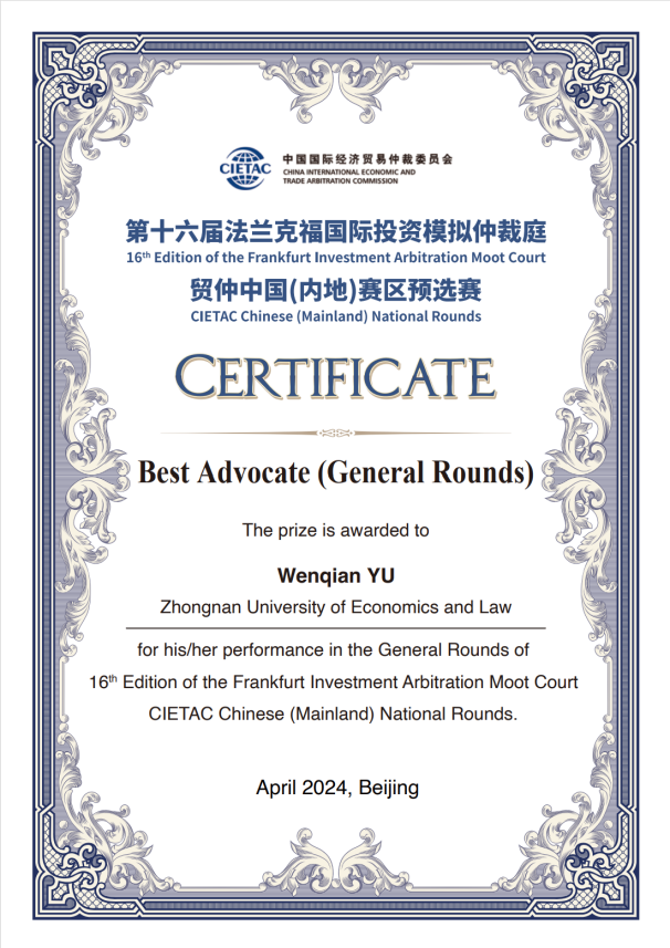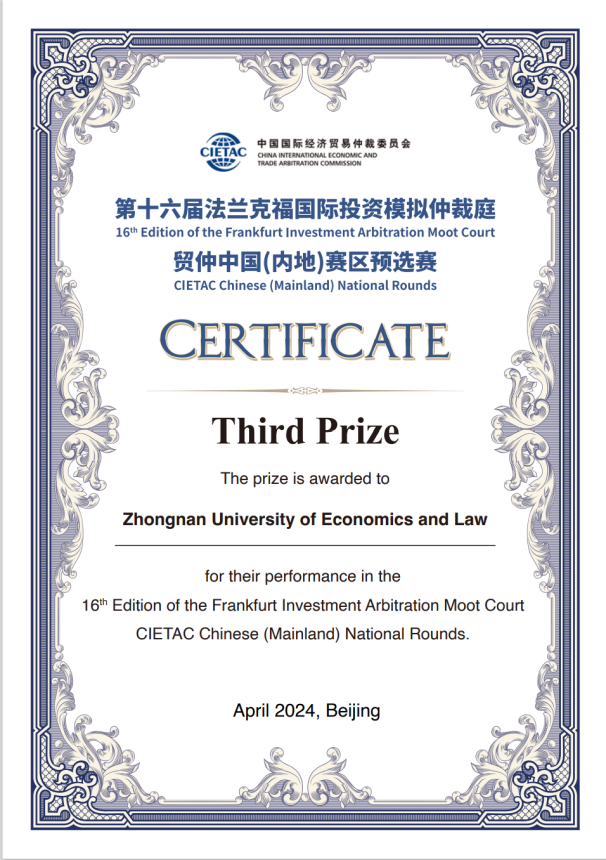 (通讯 余汶倩)4月12日,由中国国际经济贸易仲裁委员会主办的第十六届法兰克福国际投资模拟仲裁庭-贸仲中国(内地)赛区预选赛圆满结束,我校代表队荣获全国三等奖,法律硕士教育中心23国际仲裁班余汶倩获“最佳辩手”称号。