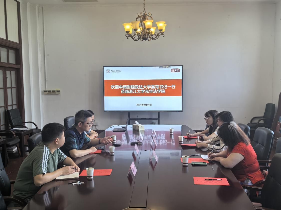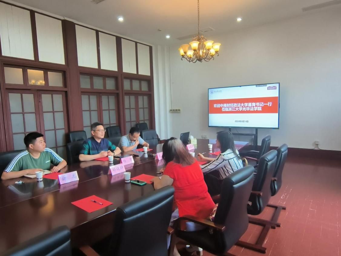 (通讯员 马晨娇)6月14日,法学院党委副书记、法律硕士教育中心学生党总支书记易育,法律硕士专业学位(诉讼与非诉法律实务)方向导师导师组副组长、副教授、法学实验教学中心秘书长邓晓静,辅导员马晨娇前往浙江大学光华法学院调研交流。浙江大学光华法学院副院长陆青,团委副书记俞龙,党政办公室副主任、教育教学中心副主任南王儒参与此次调研座谈。