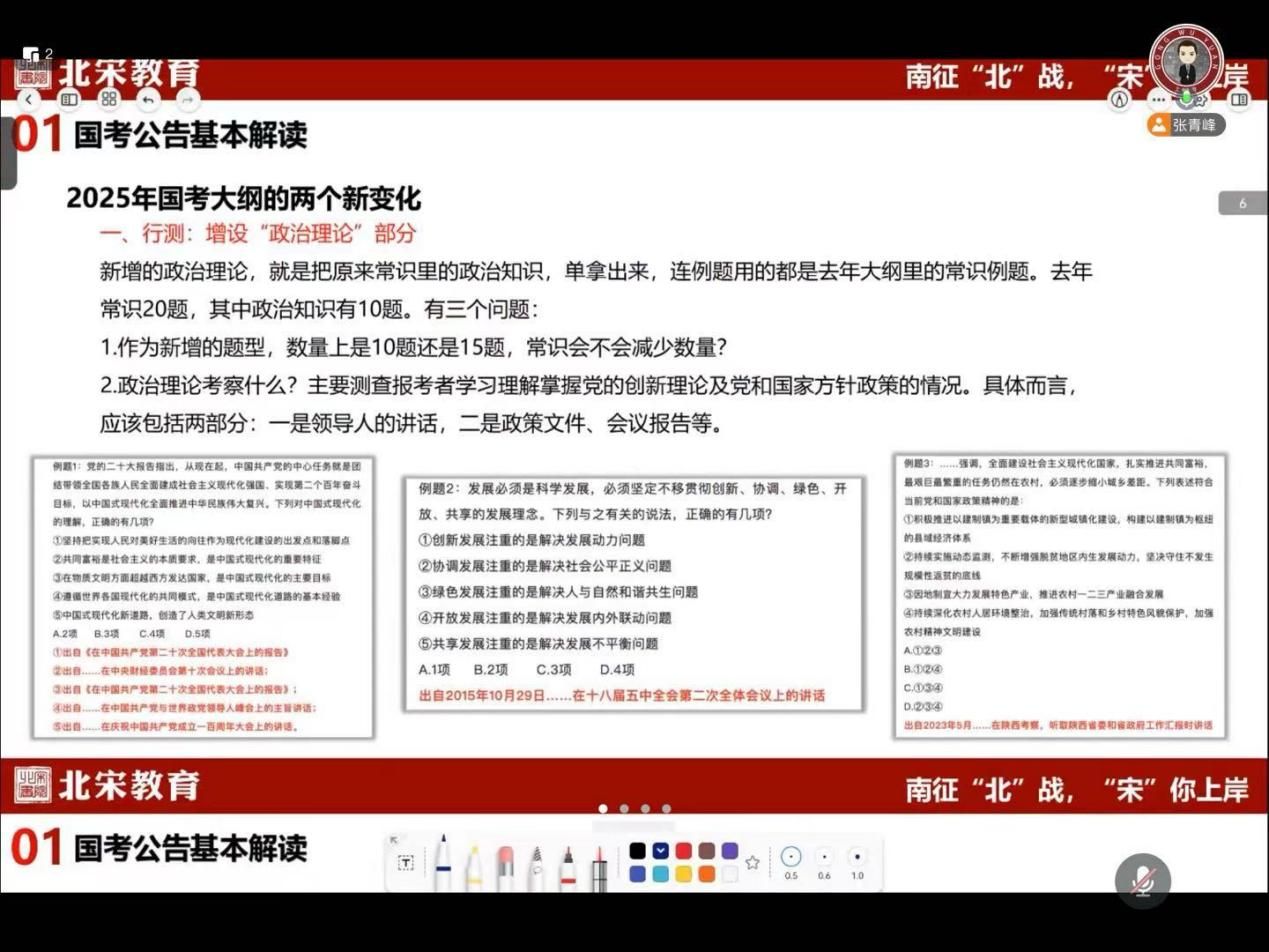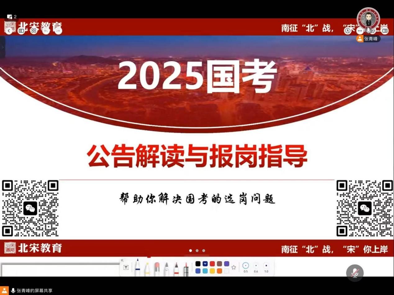 在第一部分“国考公告基本解读”中,张青峰老师提醒同学们关注国考重要的时间节点和招录流程,指出了2025年国考大纲的两个需要注意的新变化,强调了考试过程中的答题规范问题,并通过数据变化从报录比、招录岗位数量等方面对国考基本情况做了详细分析。