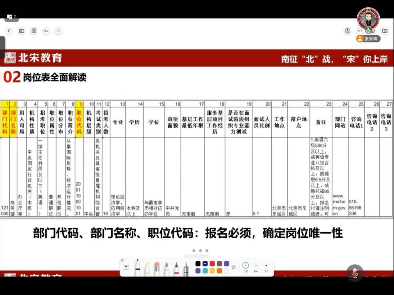 在“岗位表全面解读”板块,张青峰老师介绍了国考相关信息的搜索渠道和检索重点,并对岗位表中“1-部门代码”到“27-咨询电话”各栏信息做了全面解读,帮助同学们对国考岗位表有更为清晰的认识,厘清考试科目,提高岗位匹配度,缩小信息劣势。
