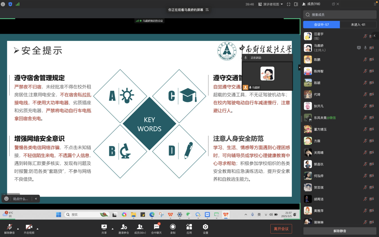 最后,针对针对近期高发的网络诈骗案件,余安琪老师通过反诈宣传片与案例解析,强化学生网络安全意识,同时重申宿舍用电、校园交通等管理规定,为同学们营造安全有序的学习生活环境。