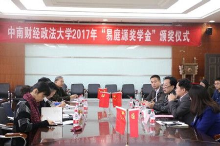 11月15日下午, 2017年“易庭源奖学金”颁奖典礼在文泉楼401室举行。易庭源第三子、“易庭源奖学金”设立方代表易工城先生、学校教育与发展基金会秘书长阮世喜、副秘书长万莉、会计学院院长张敦力、会计学院党委书记肖翠祥、会计学院副院长王雄元、会计学院硕士教育中心主任郭飞、院党委副书记王延等出席典礼。