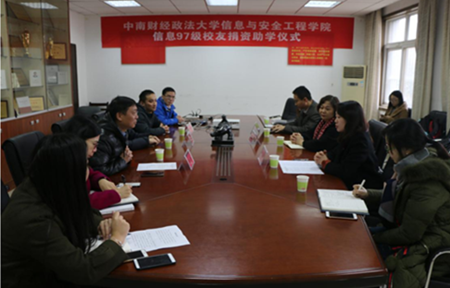 12月1日上午9:00,我校信息与安全工程学院信息97级校友捐资助学仪式在文永楼203会议室举行。出席本次捐资仪式的有信息与安全工程学院信息97级校友代表刘坤,米兰电竞·(中国区)学生资助中心主任兼学生工作部副部长徐桂菊,校办、校友办、基金办副主任万莉,信息与安全工程学院副院长金大卫教授以及学院师生代表。捐资仪式由信息与安全工程学院党委副书记刘永新主持。