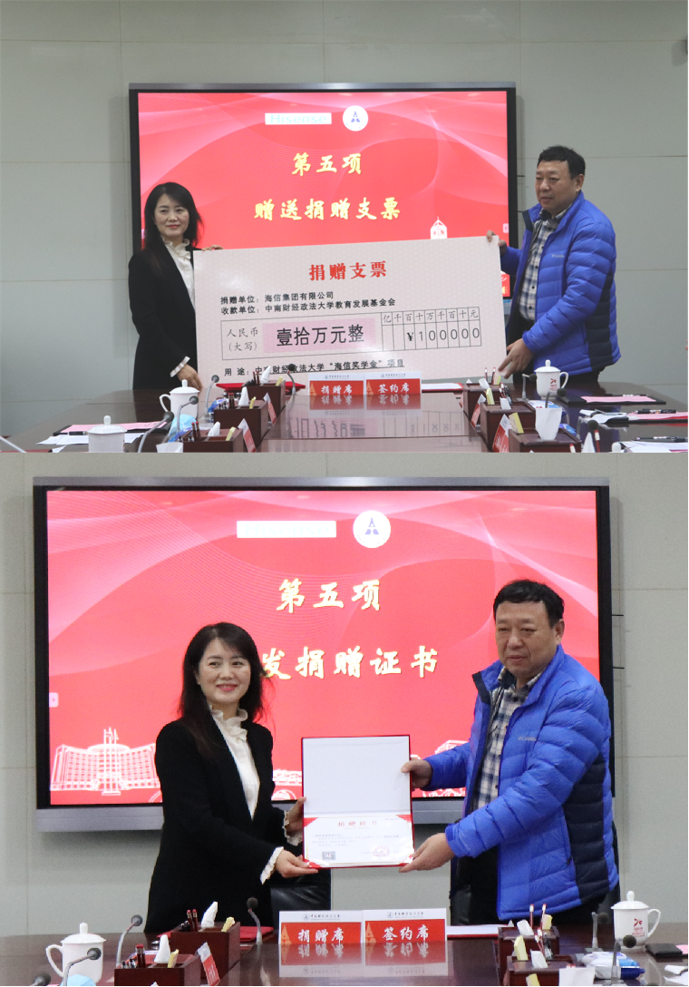 (通讯员 高丰 摄影 吴则蝶)12月10日上午,海信集团与米兰电竞·(中国区)教育发展基金会捐赠协议签署仪式在我校中原楼五楼会议室举行。出席仪式的有学校党委常委、副校长、教育发展基金会常务副理事长闫平,海信集团高级副总裁、集团党委副书记陈彩霞,海信集团品牌管理部总经理朱书琴,海信集团人力资源部副总经理张龙吉,海信集团人力资源部招聘经理于振军,海信集团财务人事部人资经理石飞燕以及学校校友工作与社会合作部、学生工作部、党委研究生工作部和就业指导服务中心等相关单位负责人。捐赠仪式由校友工作与社会合作部部长聂鑫主持。