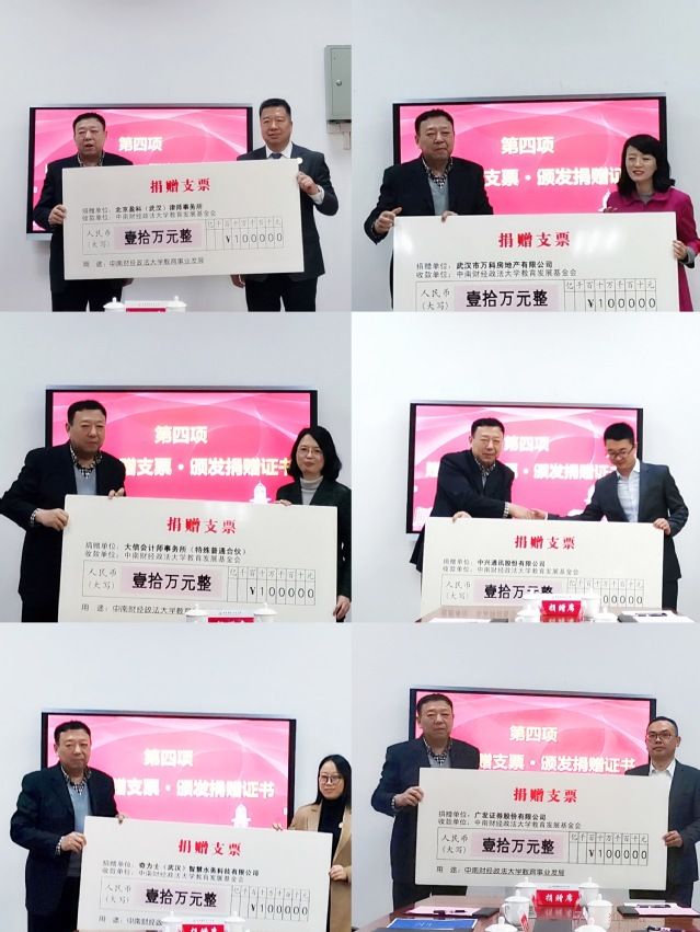北京盈科(武汉)律师事务所等六家捐赠企业代表向校方赠送捐赠支票。
