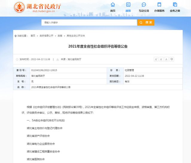 相关链接:2021年度全省性社会组织评估等级公告http://mzt.hubei.gov.cn/fbjd/zcwj/zcfg/202204/t20220422_4093804.shtml