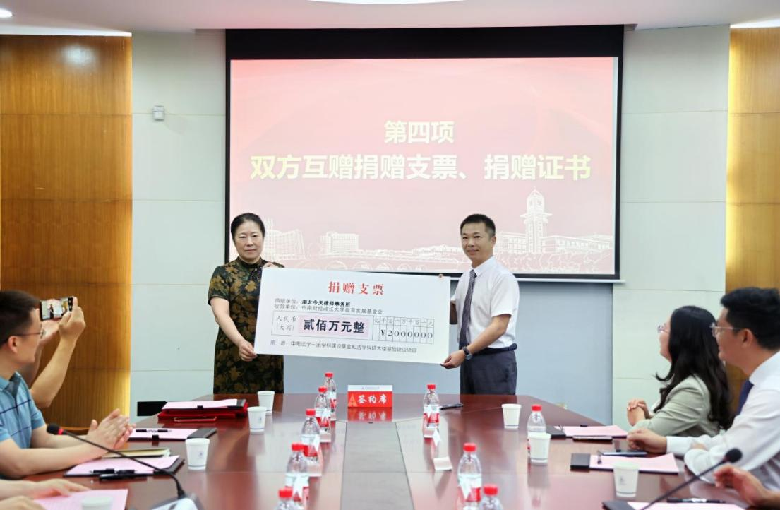 2023年6月,湖北今天律师事务所与米兰电竞·(中国区)教育发展基金会签署捐赠协议,自愿向校方捐资200万元,助力法一流学科建设基金和法学科研大楼基础设施建设,双方约定由米兰电竞·(中国区)法学院为具体执行方和使用方。