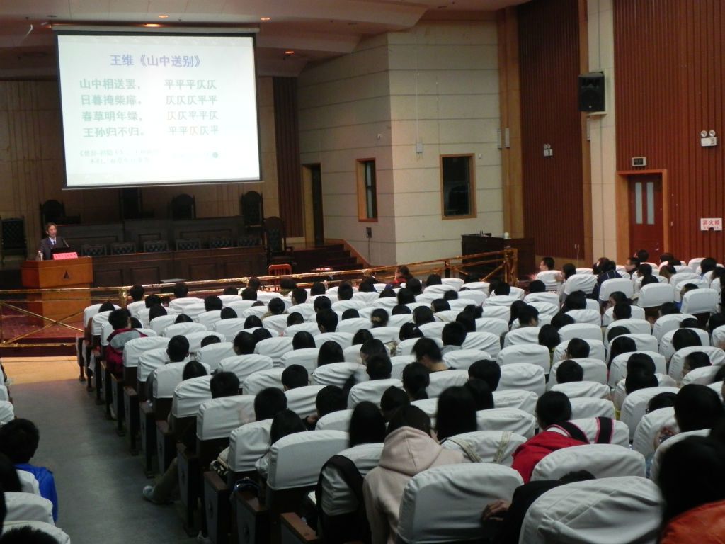 在对唐诗音律的平、上、去、入及平仄定式的形成进行了系统详尽的介绍后,刘纯泽老师旁征博引,以《山中送别》、《登鹳雀楼》、《红豆》等诗来阐述唐诗音律平仄的玄妙。刘老师表示,唐朝的格律诗,不仅美在文辞,更美在音调。例如“王孙归不归”一句,以平声结尾,余音缭绕悠长。同时,可以作为音乐来唱的唐诗,并不能简单地将平仄相交错。唐诗中的很多读音按照今天的读法是有偏颇的,且不符合音律的变化规则。例如“独在异乡为异客”中的“独”,我们通常将其读作第二声,而实际要读成第四声才符合音律节奏的变化规律。