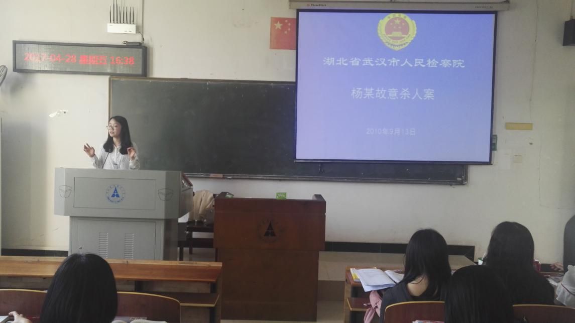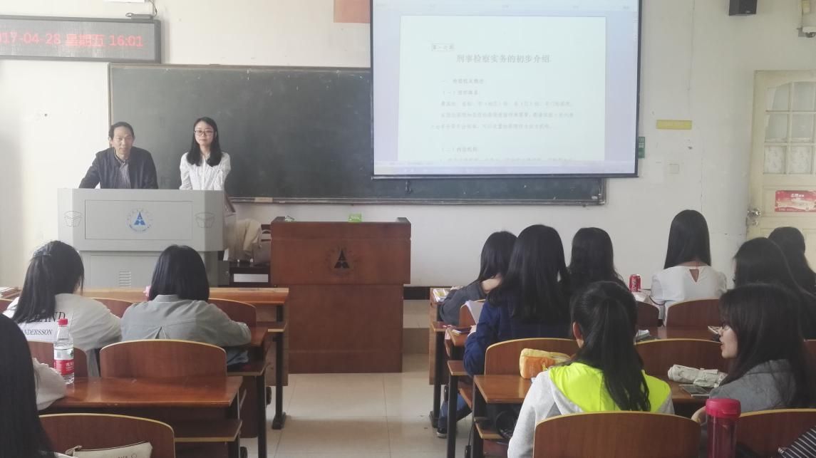 4月28日下午,主题为“公诉理论与实务”的诉讼实务课在文澜109教室顺利进行。本次法律职业实务课教学由法学院诉讼法系主任严本道老师主持,东湖新技术开发区人民检察院审查批捕与公诉部负责人、我校杰出校友陈薇检察官担任主讲人。这次专题授课旨在为法学院14级的同学们讲解作为一名检察官所应当具备的实务能力,提升大家的法律专业素养和诉讼实践能力。