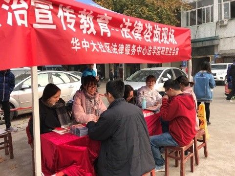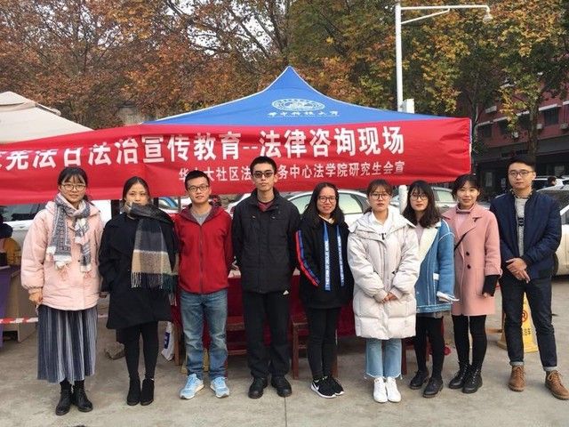 12 月4日中南法援联合华中大社区法律服务中心开展宪法宣传活动,志愿者们通过宪法朗诵、宪法演讲和法律知识问答等方式进行普法教育,宣传十九大精神,向师生发放宪法、民法总则等法律文本,为在校师生提供法律咨询服务。