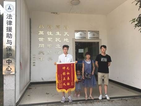 2018年5月16日下午,当事人的母亲向中南法援15级志愿者巨少军和黄思源赠送锦旗表达对其的感谢,也对中南法援的法律援助保护工作给予高度评价,并同志愿者进行合影留念。