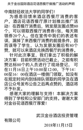 2018年11月13日,金谷酒店的官方微信公众号发布一则推文,声称为迎接感恩节的到来,酒店特推出回馈活动,并于推文中承诺,凡将推文转发至朋友圈获得一定点赞数后,可凭获赞数兑换相应奖励。