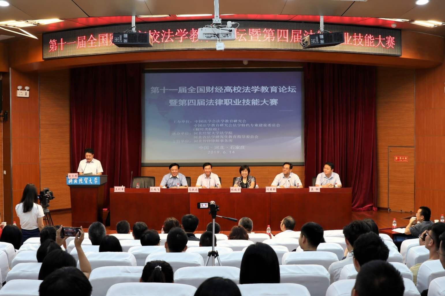 (通讯员 张宝丹)六月花开芳香满园,法律学子齐聚石家庄。2019年6月15日,第十一届全国财经高校法学教育论坛暨第四届法律职业技能大赛在河北石家庄举行。此次论坛由中国法学会法学教育研究会主办、河北经贸大学法学院承办,全国共有30多所财经高校法学院系的师生参加了此次论坛和大赛。我校法学实验教学中心秘书长邓晓静老师、法律硕士教育中心的易育书记,带领研究生张宝丹、农恒出席了本次论坛。