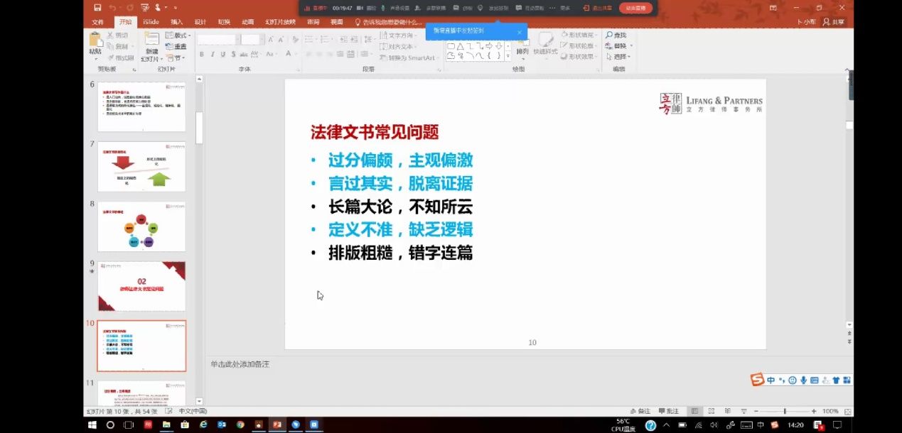 在线上,卜律师主要围绕起诉状、调查取证申请书、代理词、答辩状、管辖异议申请书、质证意见、上诉状等六种法律文书的结构模式及其内容写作展开教学,期间不断地结合其承办案件的法律文书为同学们作指导说明。在介绍了律师法律文书的基本概念之后,卜律师通过众多实际的例证,向同学们从语言、证据、叙写重点、定义和排版等六个方面罗列了见习律师在执业初期制作法律文书的常见错误,让大家更加直观地了解和规避这些错误,从而避免再犯。