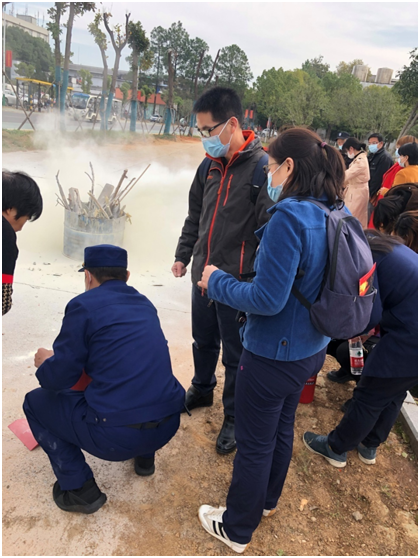 讲座结束后,老师和同学们前往五羊广场参加现场消防演练。消防救援站向大家详细的介绍了火灾救灾现场通常会运用到的一些装备,展示了灭火器的使用方法,并现场带领老师和同学模拟火灾现场逃生场景。