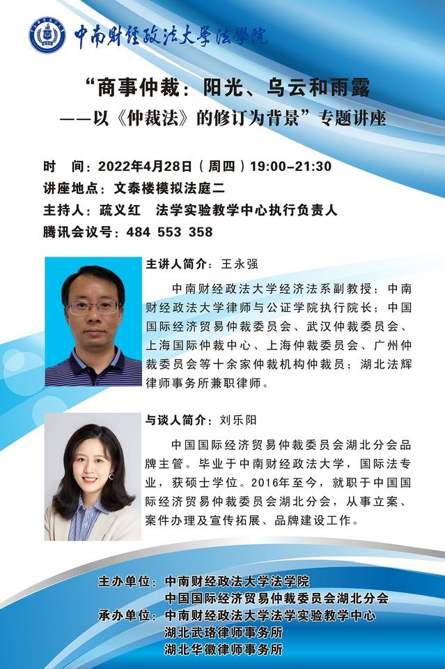 讲座预告:仲裁法系列活动之“商事仲裁:阳光、乌云和雨露——以《仲裁法》的修订为背景”专题讲座