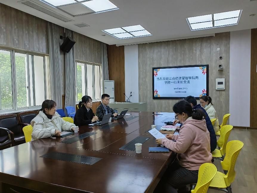 (通讯员陈越)2023年3月22日,云南经济管理学院商学院法学专业教研室主任孟佳、法学实验中心负责人杨尚源老师一行访问我校法学实验教学中心,中心执行负责人疏义红老师、方玉珍老师、中南北辰信息科技有限公司陆巧莲女士、法学院宪法与行政法专业博士研究生杨丰合参加此次交流活动。疏义红老师对孟佳主任一行表示热烈欢迎,带领孟主任一行进行实地参观,然后就实验中心与实验课程建设详细座谈。