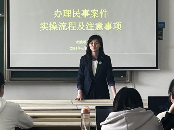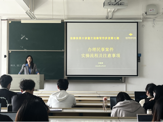 (通讯员 鲍致远)4月9日,法律硕士教育中心“2024年法律实务大讲堂之法律写作沙龙第七期”在我校文添楼416教室如期举行。本期法律实务大讲堂由法律硕士教育中心研究生会和法学实验教学中心联合主办,湖北观筑律师事务所高级合伙人、管理委员会委员龙婉蓉律师担任主讲嘉宾。此次法律实验教学活动,龙律师选择了以“办理民事案件实操流程及注意事项”为主题进行授课,旨在帮助法律硕士研究生们更好地理解和掌握律师处理民事案件的核心技能,养成法律职业伦理,为未来的法律职业生涯打下坚实基础。