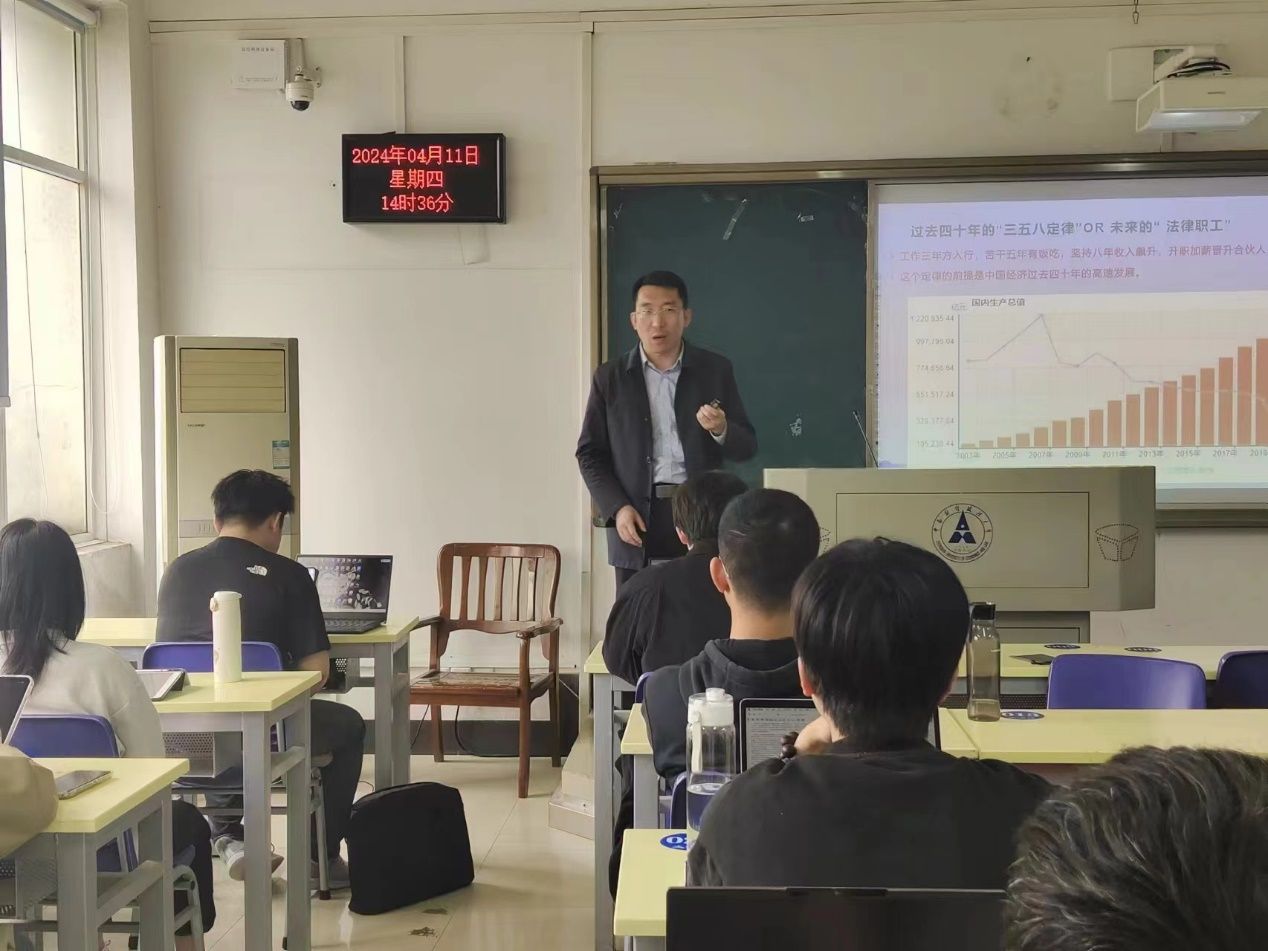 2024年4月11日,“2024年法律实务大讲堂之司法原理与实务沙龙第七期”继续在我校文添楼101教室如期举行。此次法律实验教学活动,主讲人湖北敬卓律师事务所合伙人、敬卓实习项目和人力资源规划负责人胡道君律师选择以“律师行业发展与法科生职业路径”为主题进行讲授,旨在切实增强法律硕士研究生对于法律实务经验的了解,帮助学生提高行业认知,为未来的法律职业选择提供助力。