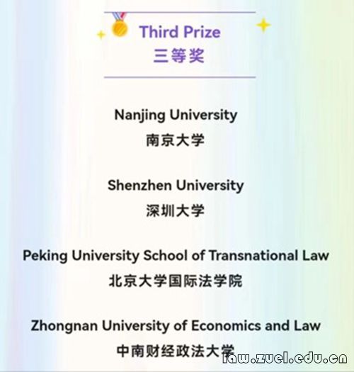 2023年12月8日,由中国国际经济贸易仲裁委员会主办的第二十一届“贸仲杯”国际商事仲裁模拟仲裁庭辩论赛(CIETAC CUP)落下帷幕,我院代表队荣获全国三等奖。