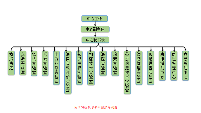 中心下设16个分支机构,包括法律援助中心、模拟法庭、司法鉴定中心、家暴援助中心和12个法学实验室(如图所示)。各分支机构均由熟悉各项业务的专业教师担任实验室主任,职责分明,中心的各项事务和日常工作得以全面有序地开展。