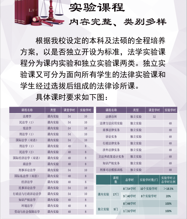 根据我校设定的本科全程培养方案,以是否独立开设为标准,法学实验课程分为课内实验和独立实验课两类,课内实验课是指要求利用一部分课内时间做实验的课,独立实验是指专门以实验的形式开设的课。具体课时要求如下表(该表中的实验课课程数仅包括毕业授予法学学位的学生所上的课程,不包括刑事司法学院部分毕业授予非法学学位的学生所上的课程,也就是说实际上,法学实验课的课程总数大于17+9门课程数。):