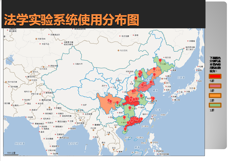 在学校、学院的大力支持下,在法学实验教学中心实验系统开发人员兢兢业业的努力下,LETS法学实验系统不断升级,日益信息化,便捷化,前沿化,得到了国内各高校的高度认可。至2016年底,签约引进LETS的国内高校已有31家,正在试用的学校共有5所,法学实验系统具体使用分布情况如图1所示: