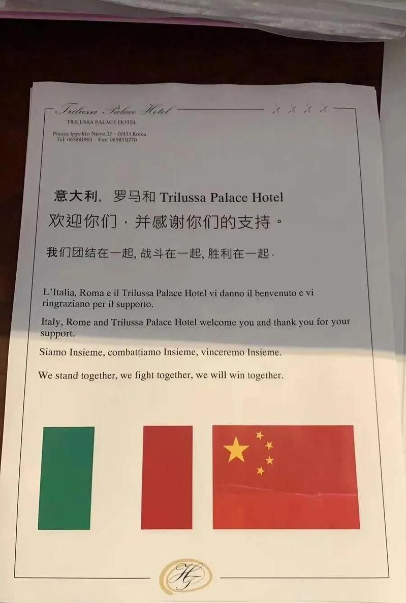 这是中国援助意大利医疗队,在酒店收到的欢迎信上的一句话。