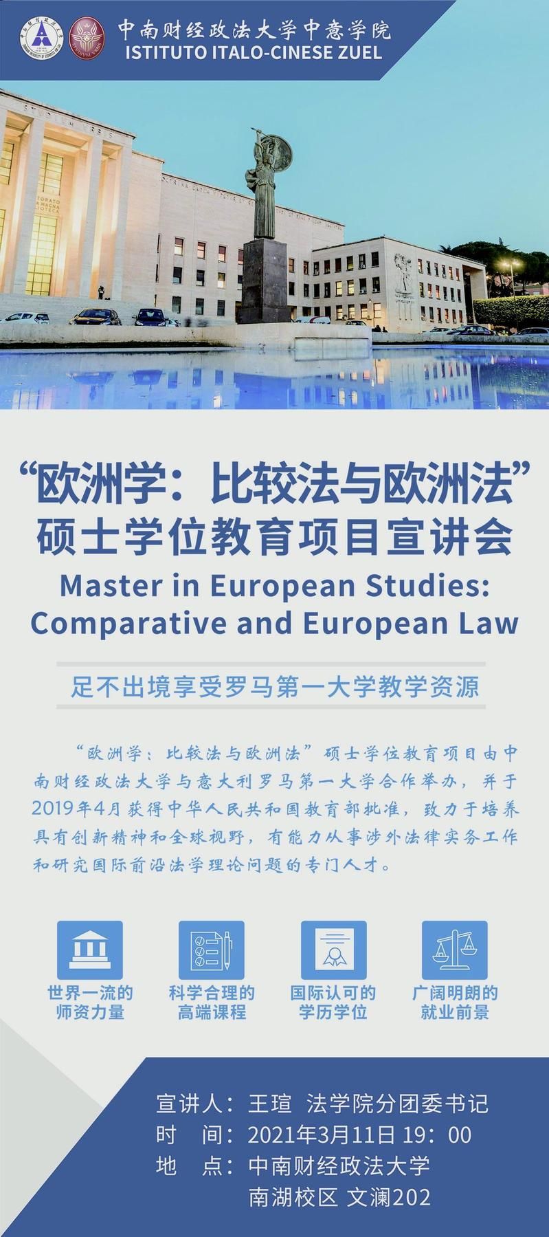 “欧洲学:比较法与欧洲法”硕士学位教育项目由米兰电竞·(中国区)与意大利罗马第一大学合作创办,并于2019年4月获得中华人民共和国教育部批准(批准书编号: MOE42IT1A20181945N)。项目旨在健全创新法治人才培养机制,育就国际一流法律人才,培养面向现代化、面向世界、面向未来,德、智、体、美全面发展,具有创新精神和全球视野,有能力从事涉外法律实务工作和研究国际前沿法学理论问题的专门人才。
