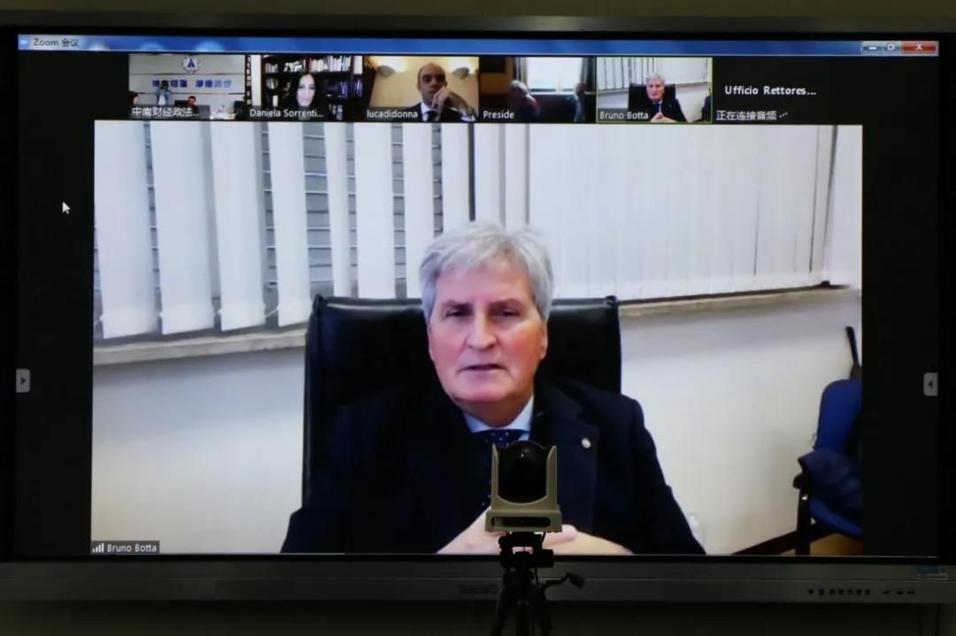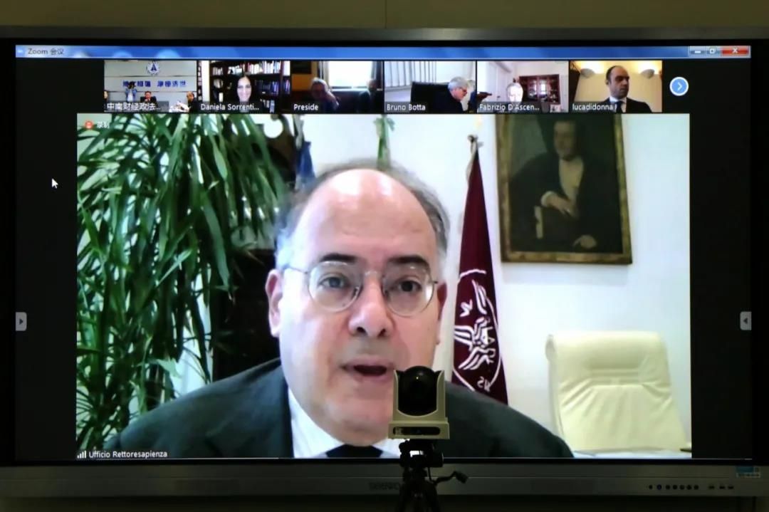 11月5日下午,我校与意大利罗马第一大学在中原楼五楼会议室召开远程视频会议。出席本次会议的意方嘉宾有罗马第一大学校长尤金·高迪奥教授,副校长布鲁诺·波塔教授,法学院院长、中意学院意方院长奥利维埃罗·迪里贝托教授,经济学院院长法布里齐奥·达山佐教授,法学院院长助理多米尼克·杜西博士以及罗马第一大学相关部门负责人。出席本次会议的中方嘉宾有我校校长杨灿明教授,校长助理、法学院院长、中意学院中方院长徐涤宇教授,经济学院院长李小平教授,刑事司法学院院长胡向阳教授,国际教育学院黄娟院长,国际交流部方磊部长,法学院副院长、中意学院执行院长李俊副教授,法学院黄美玲教授以及来自我校相关部门的工作人员。